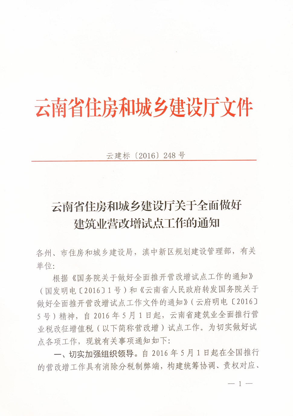 關(guān)于全面做好建筑業(yè)營(yíng)改增試點(diǎn)工作的通知 云建標(biāo)[2016]248號(hào)