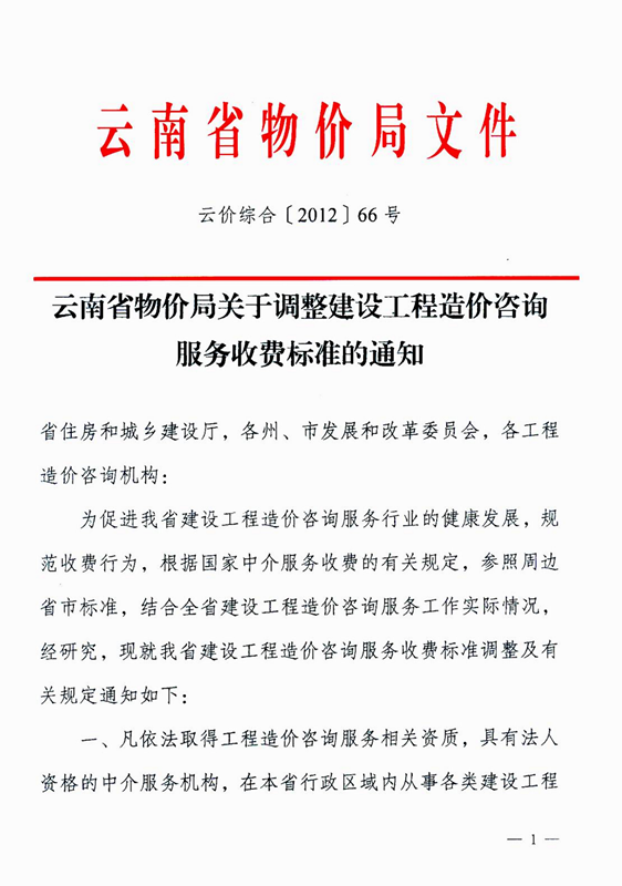 云南省物價局關(guān)于調(diào)整建設(shè)工程造價咨詢服務(wù)收費標(biāo)準(zhǔn)的通知 云價綜合[2012]66號