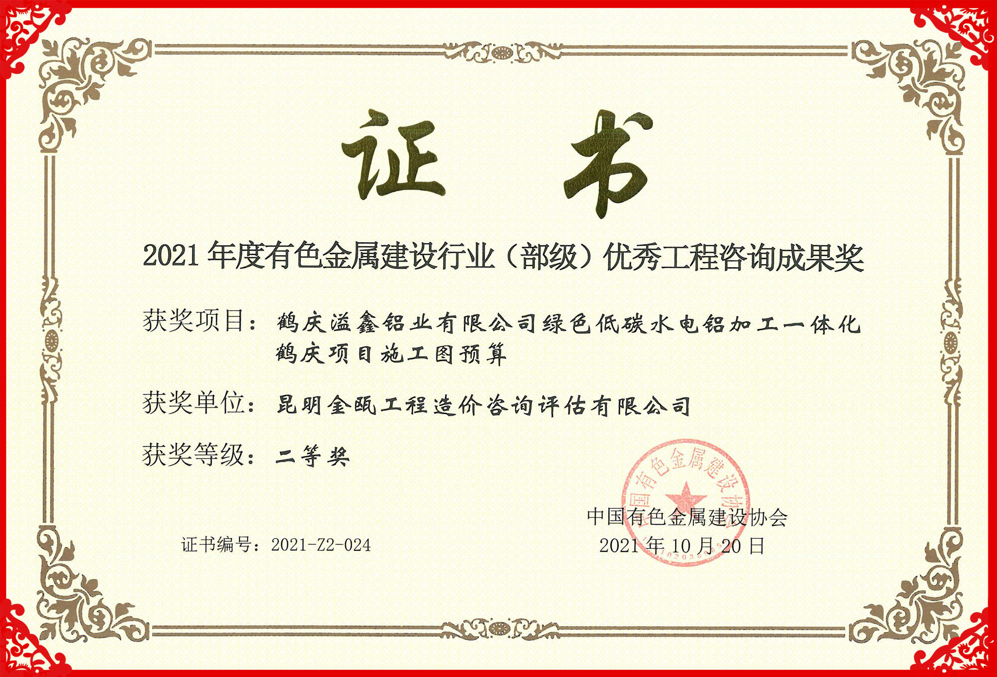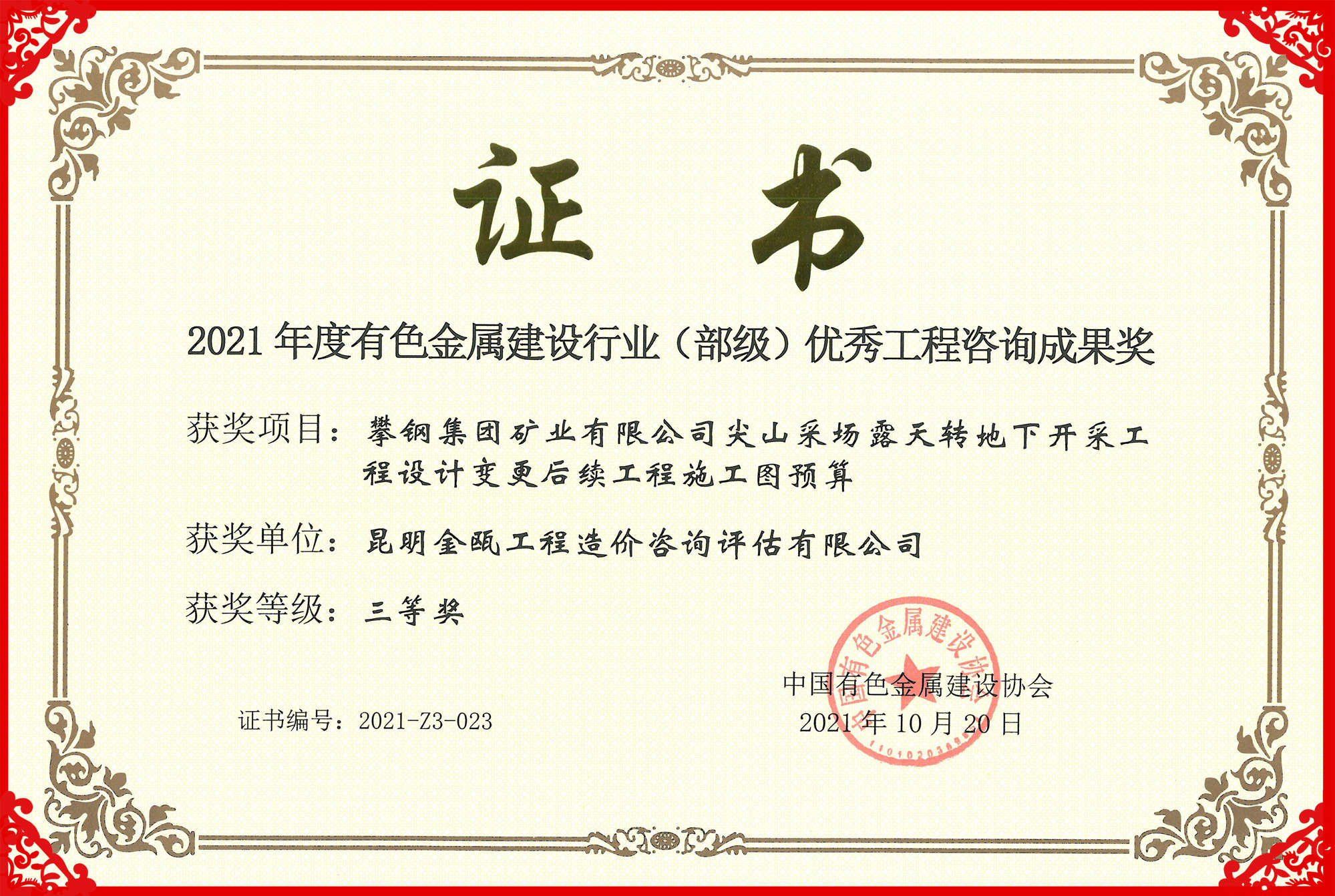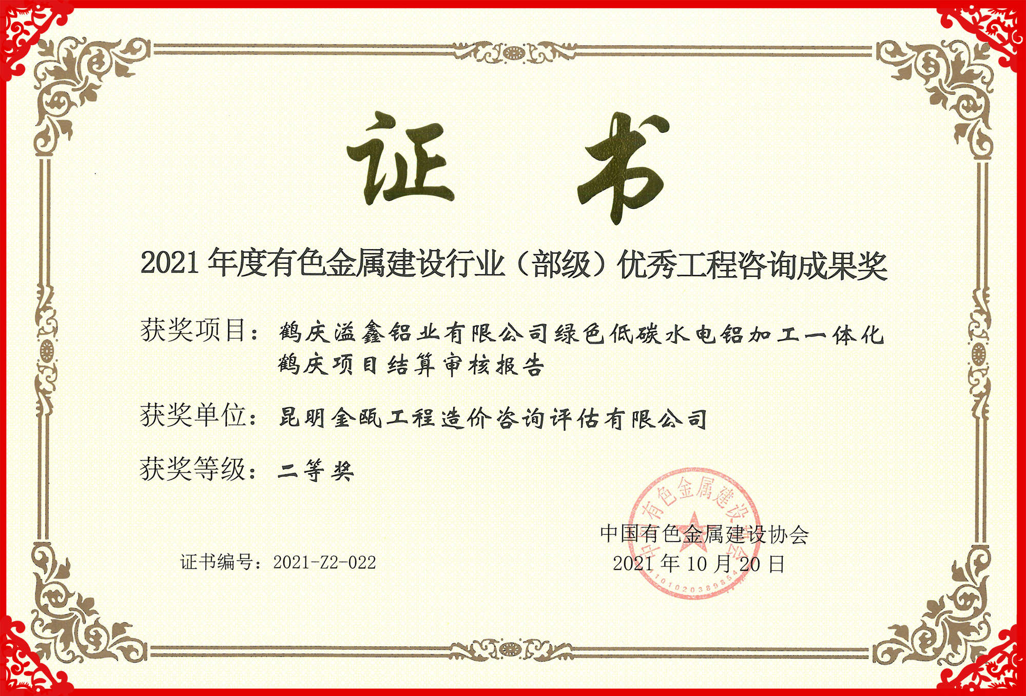 熱烈祝賀昆明金甌工程造價咨詢評估有限公司在2021年度中國有色金屬建設行業(yè)咨詢成果評獎活動中