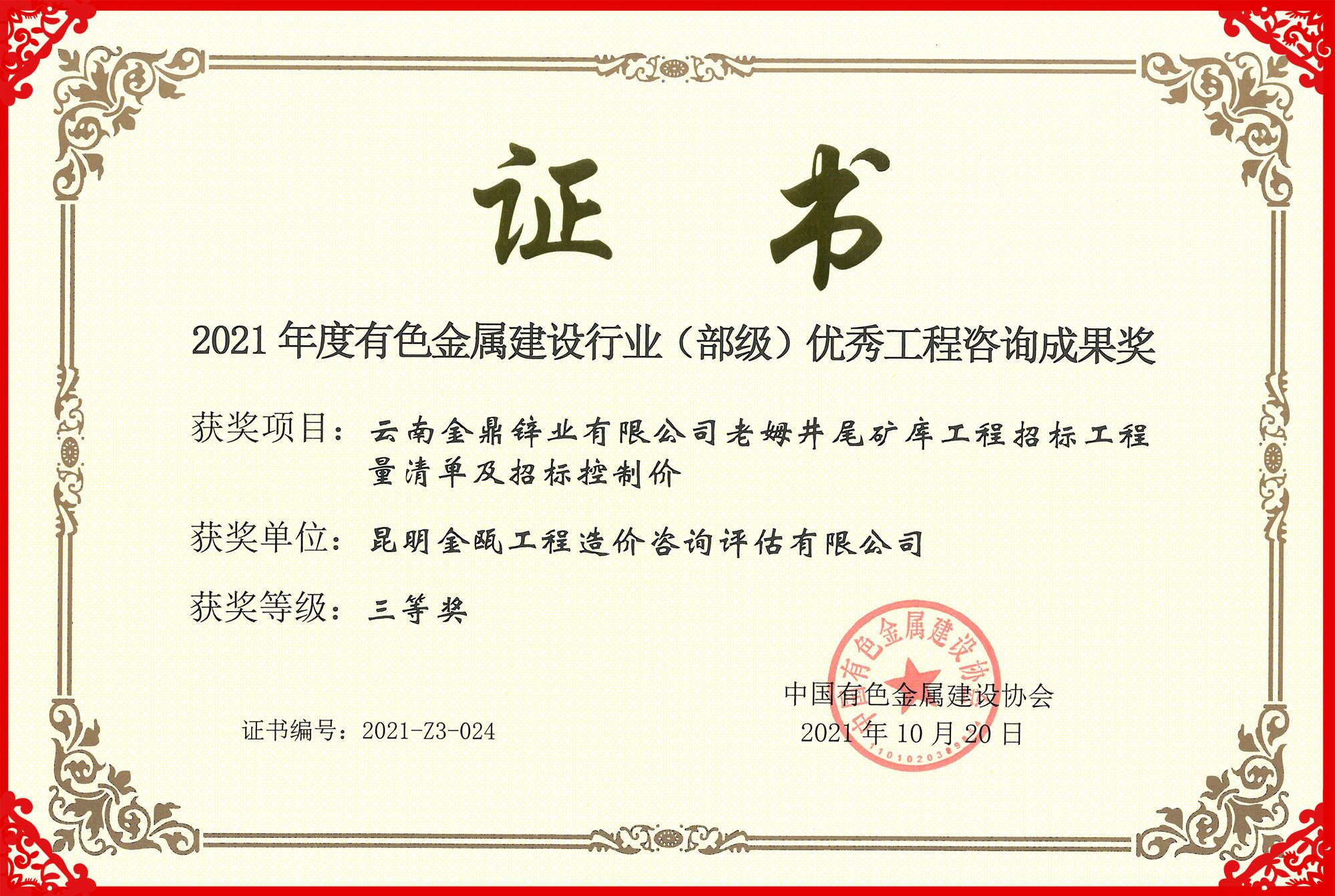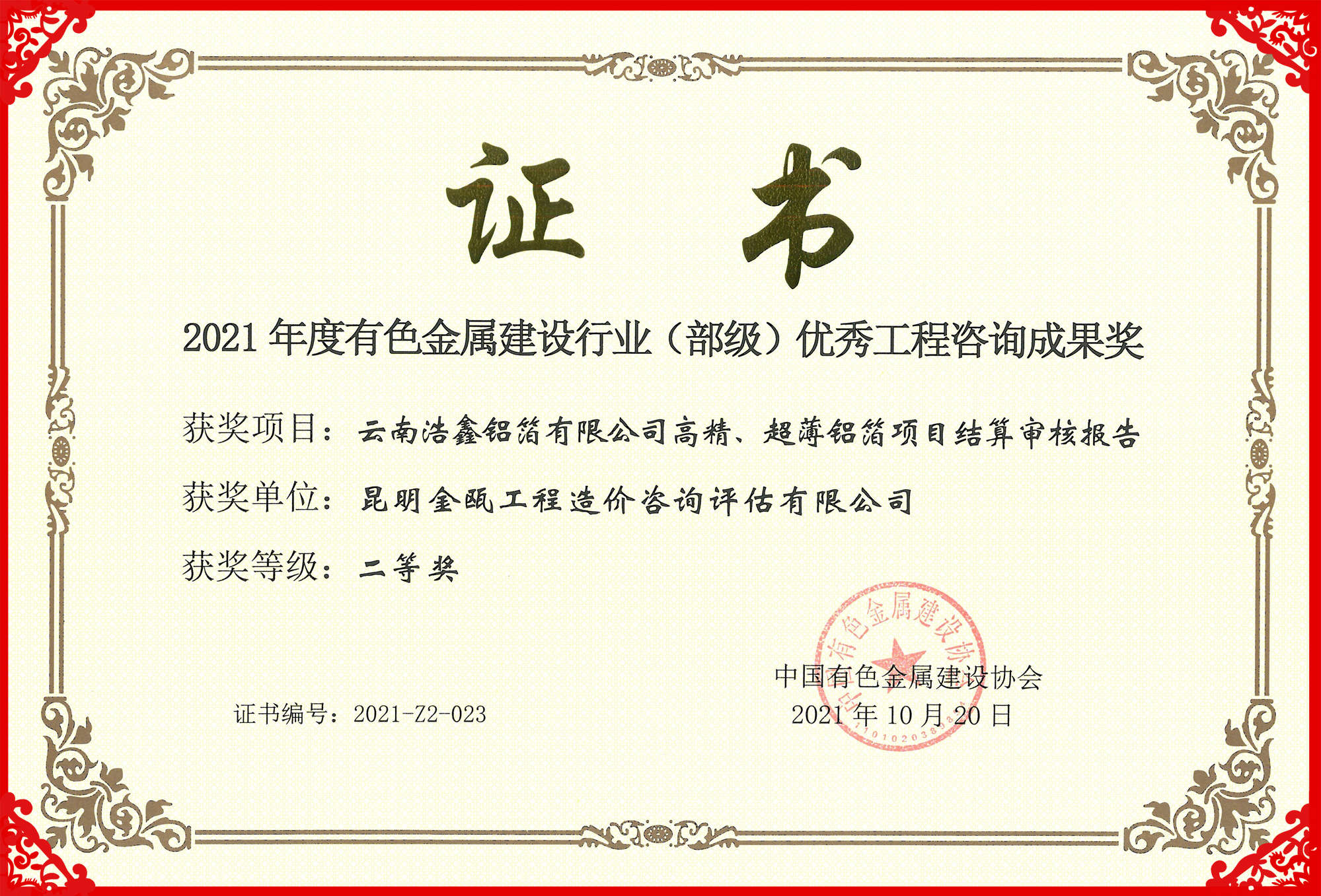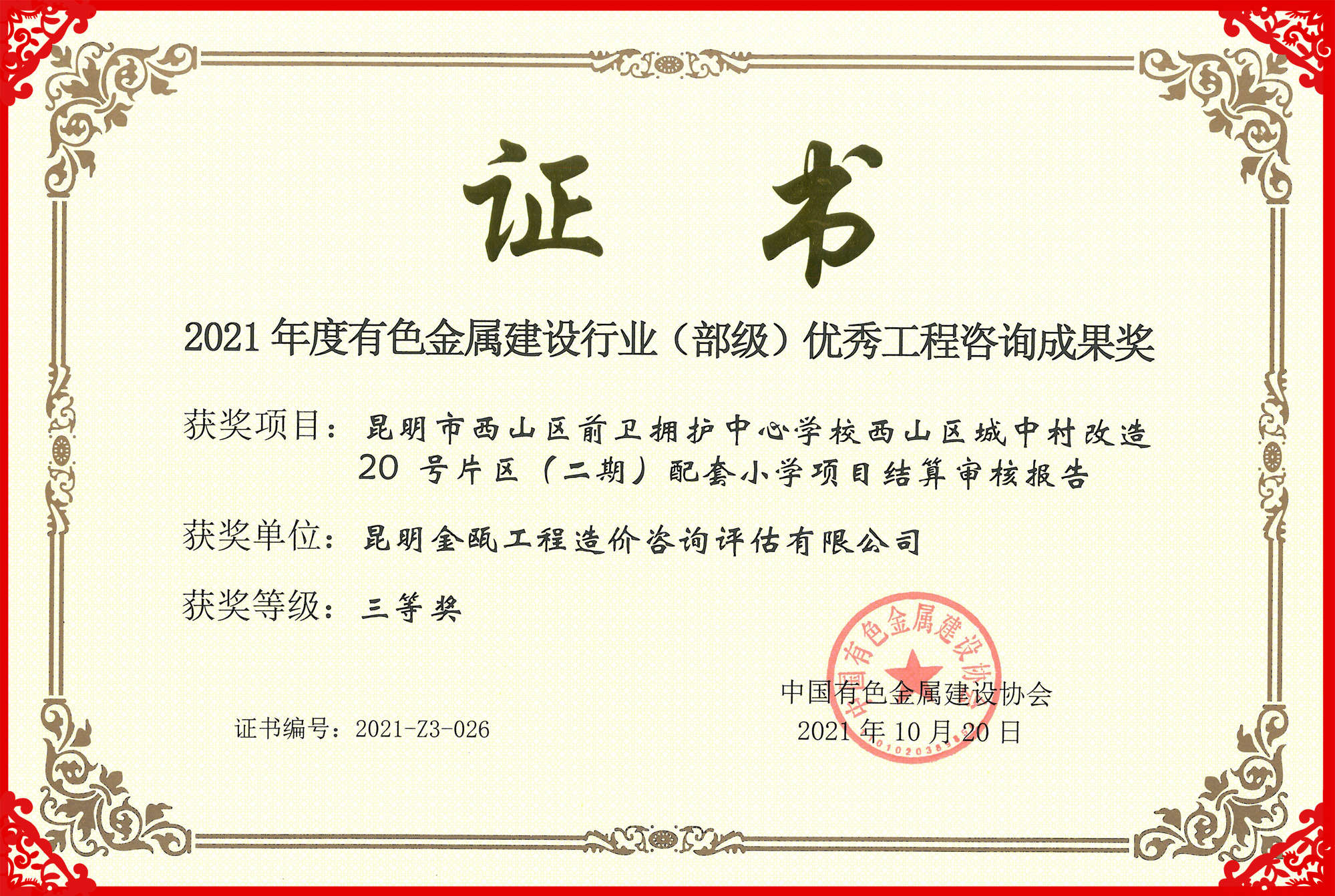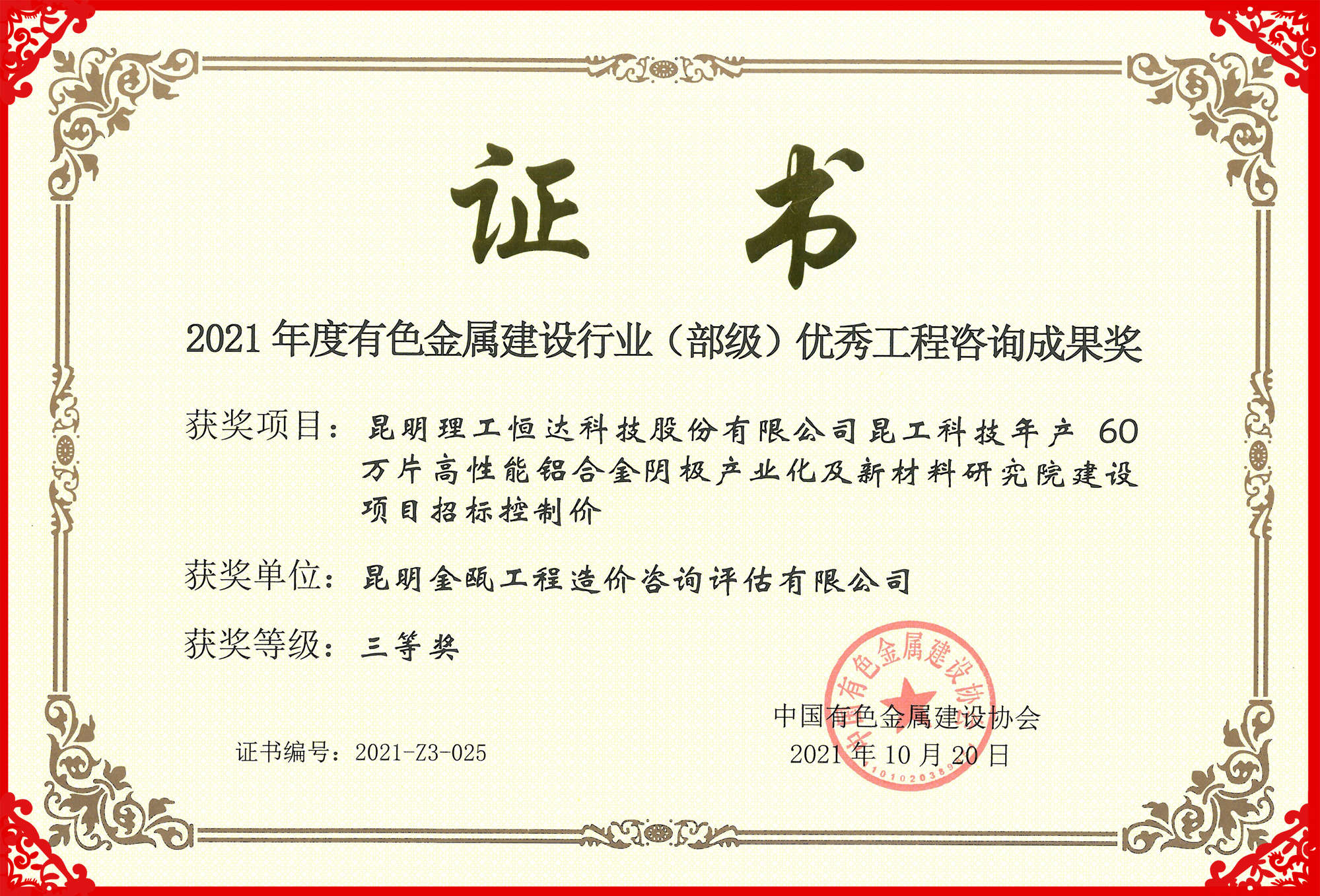熱烈祝賀昆明金甌工程造價咨詢評估有限公司在2021年度中國有色金屬建設行業(yè)咨詢成果評獎活動中